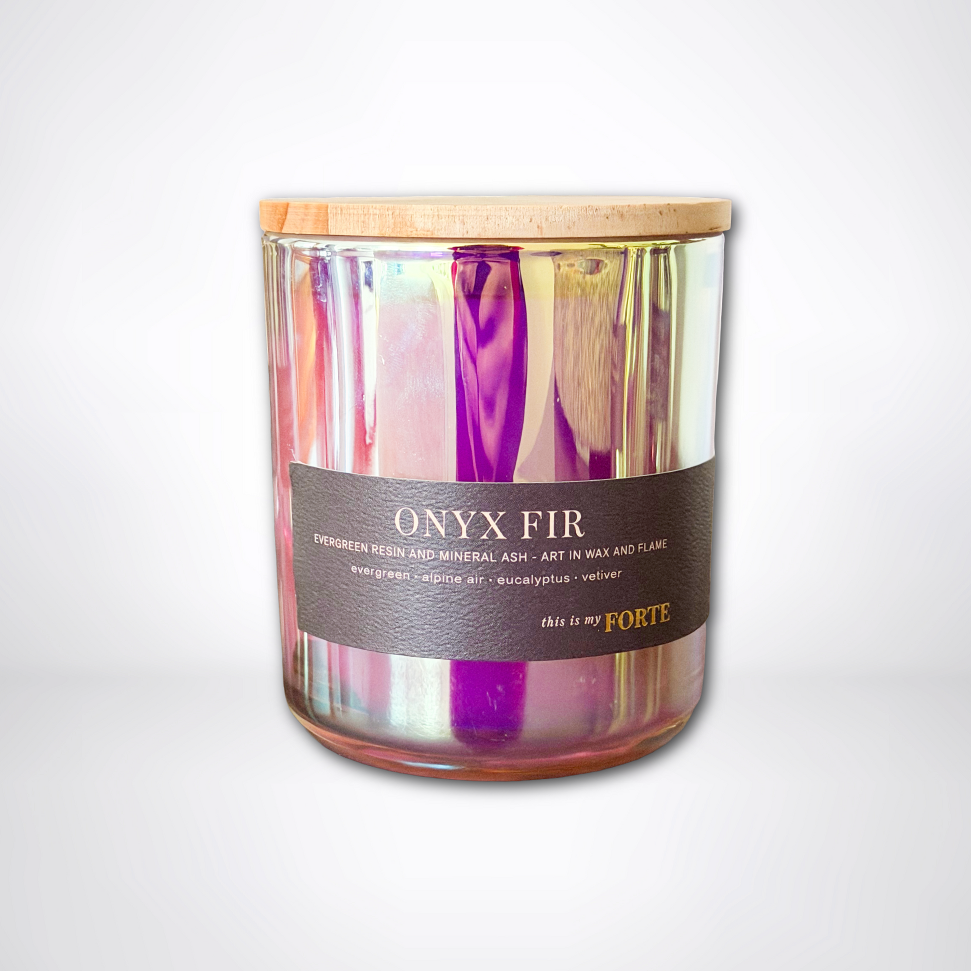 Eucalyptus sharpens the lift. Vetiver grounds it with mineral depth. Volcanic ash adds dry, smoky tension — evergreen transformed into architecture. Prismatic glass throws cool greens and charcoal shadows — clean, magnetic, year-round.